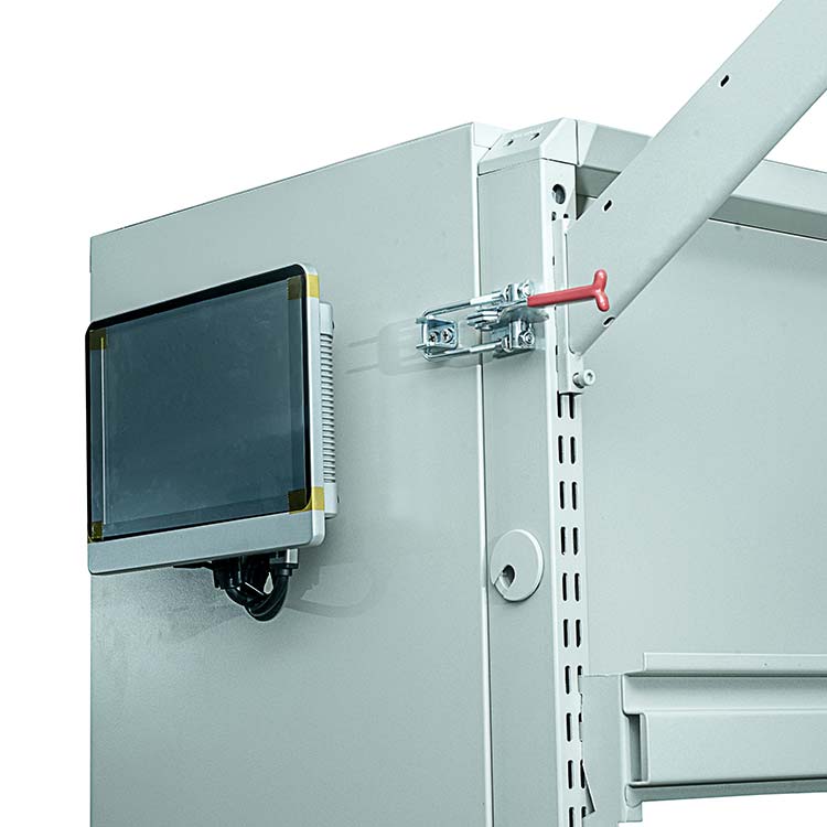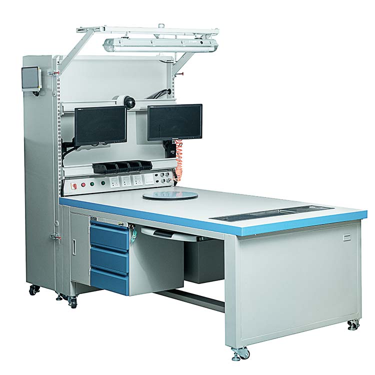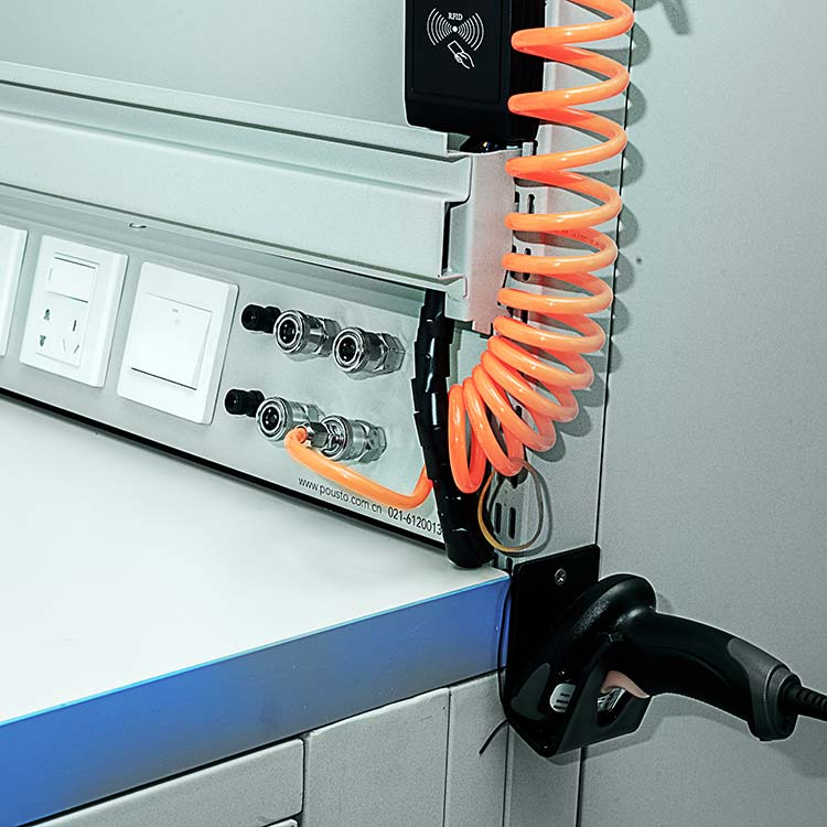 多功能工作臺具有掃碼,監(jiān)控攝像,報警,讀卡器,氣吹槍,顯示屏等功能,并帶有隱藏式電控箱獨立供電